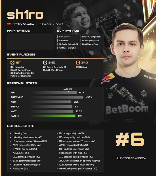 Dsh1ro凭借出色的数据和堪称巅峰的表现,作为Spirit队内的第二明星选手赢得了许多个人荣誉,在2024年Top 20选手榜单中位列第6位。