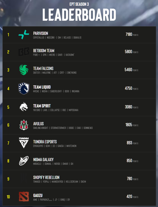 近日,ESL赛事运营在他们的官网上发布了最新的DOTA2队伍EPT积分榜。