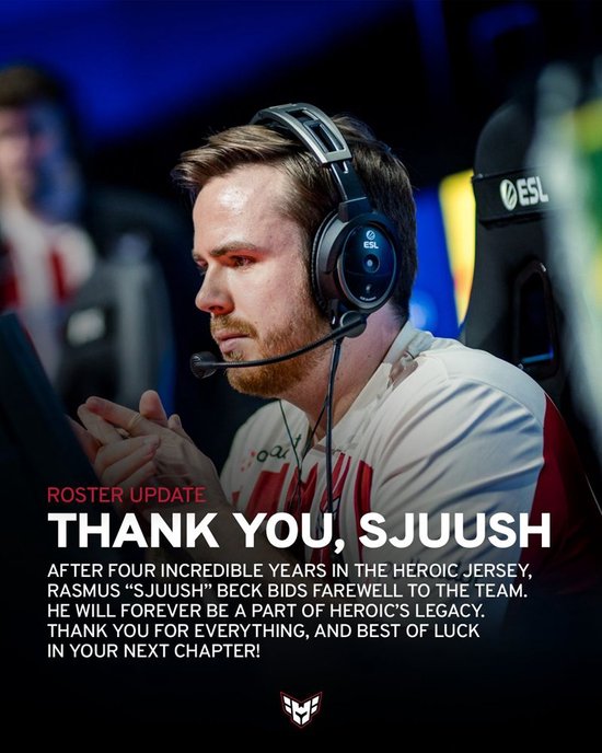 HEROIC:怀着沉重的心情,我们在度过了4年难忘时光后,向sjuush道别。感谢你的一切。