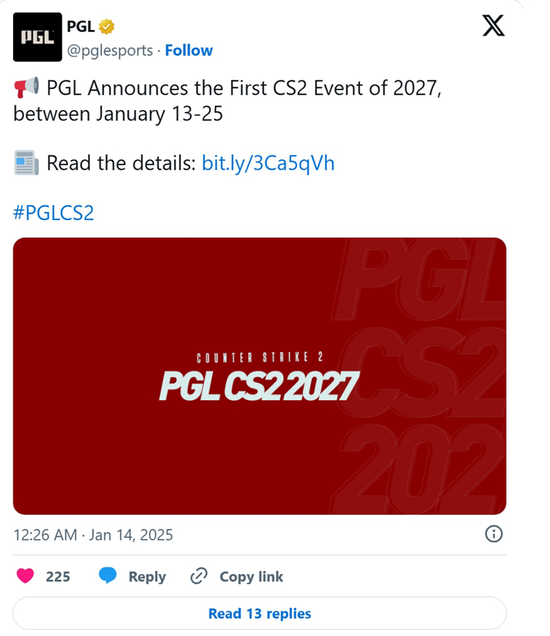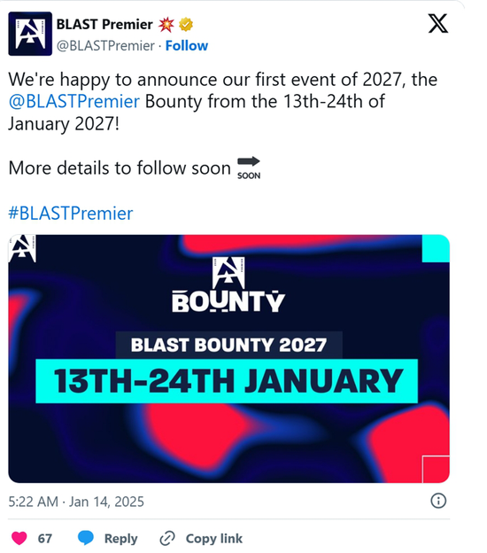 BLAST将于2027年1月13日至24日举办赏金赛,这与PGL今天宣布的一项赛事时间几乎重合。