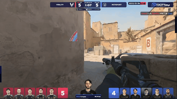Metizport手枪局进攻B区,被包点mezii与ropz击杀掉三人,补防来的flameZ收尾收下双杀,Vitality轻松收获手枪局胜利。长枪局进攻方先静摸A区再爆弹,但Vitality这边枪法完美解决,经济局后小蜜蜂取得4-0领先。第五回合ZywOo中路先狙掉一人,中期进攻方进攻拱门刚好抓到开镜视野受限的ZywOo,flameZ也只击杀了一人,下完包后Metizport完成二打二守包,进攻方拿到第一分。第七回合hampus险些完成一打四,静摸贴超市近点击杀ropz后两次假下包击杀掉两人,切手枪可惜没能打过ZywOo。Vitality展示严密防守,枪法也胜过对手许多,上半场仅仅只让对方拿到了两分。