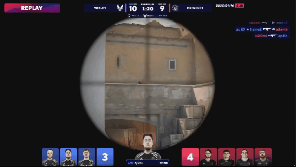 换边后Plopski手枪局三杀,钢枪局又四杀,Metizport收下经济局后反超比分,为8-7。长枪局ZywOo大狙立马发力收获三杀,下一局对方打B,沙地的ZywOo混烟爆头打死过点的土匪,回防过程中又盲狙击杀一人,flameZ也取得双杀,成功拆除炸弹。第二十回合Metizport打A,apEX架烟只击杀了一人,好在有ZywOo兜底,大狙取得三杀助力队伍拉开比分。小蜜蜂顺势收下比赛,比分13-9。