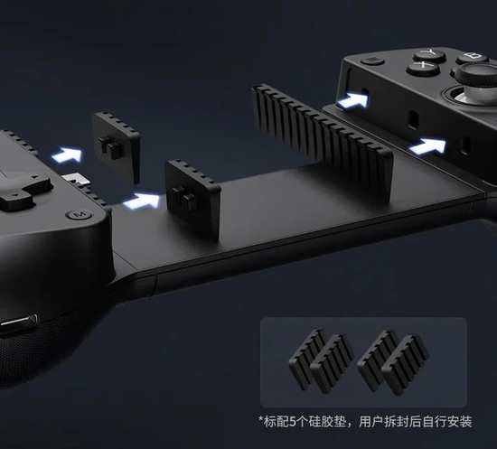 手柄标配5个不同类型硅胶垫,玩家可以根据不同手机的厚度,按需进行拆卸安装,在硅胶垫的作用下,手机的夹持更加稳固又能避免损伤。