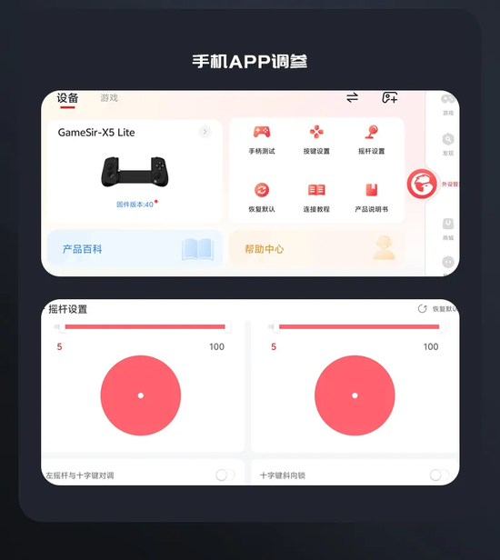 玩家能通过手机APP对手柄参数进行调整和设置,包括摇杆死区范围、十字键斜向锁、左摇杆与十字键对调等。