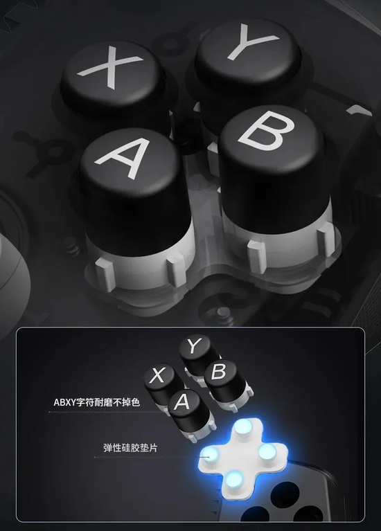 ABXY键同样拥有200万次寿命,其中的弹力硅胶垫片能带来Q弹的手感,每次的按压都能清晰、迅速地反馈。