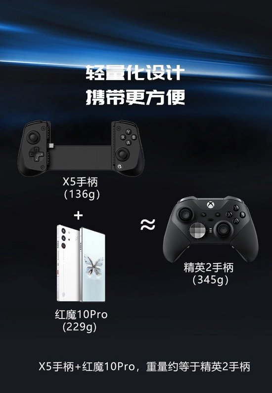 搭配市面上常见的游戏手机使用,重量就和精英2手柄相当,即使出门在外或在旅途上,玩家也能随时随地轻松享受游戏的乐趣。