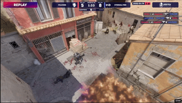 攻防转换。永恒之火铁门黄房夹击A区,但被猎鹰众人逐个击破,Falcons拿下下半场手枪局。