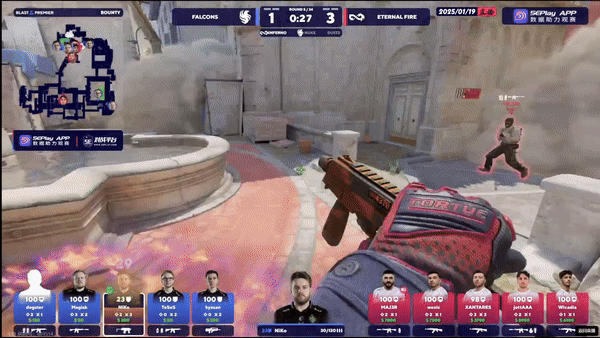 Eternal Fire先做进攻方。手枪局,Falcons单b四a防守阵型,NiKo单人等到队友抄后路夹击土匪,猎鹰先下手枪局。