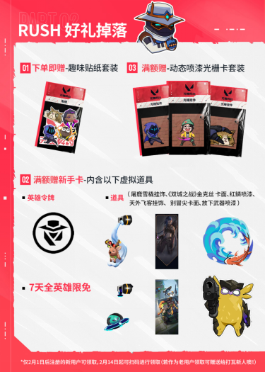 2.单笔订单满150赠【周边商城专属新手卡】,最全的新手体验,新年呼朋唤友一起打瓦!【新手卡内含1个英雄令牌、7天全英雄限免、6款道具,仅游戏新用户可领取】