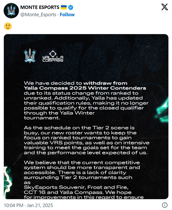 Monte明确指出,冬季赛到4月线下赛晋级途径的取消,以及赛事排名资格的丧失是其退赛的原因。Monte还批评了当前二级赛事场景缺乏透明度和问责制。