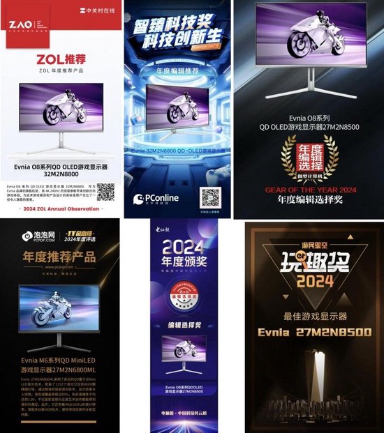 年末,在众多数码科技媒体和行业专业机构的游戏显示器评选中,M6&O8系列游戏显示器凭借其卓越的综合性能表现,脱颖而出,荣获多项大奖。特别是Evnia推出的O8系列游戏显示器32M2N8800和27M2N8500,它们分别斩获了太平洋科技、ZOL中关村在线等多家权威媒体机构颁发的“2024年度最佳游戏显示器大奖”。这些奖项充分证明了Evnia在显示技术领域的杰出能力。