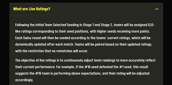A:在第一阶段和第二阶段的初始团队选拔排名后,团队将被分配与其种子排名对应的类似ELO的评分,高排名的团队将获得更多积分。每一轮瑞士制赛将根据团队当前的评分进行排名,这些评分会在每场比赛后动态更新。团队将根据更新后的评分进行配对,并且会有一个限制,即避免出现重复对战。