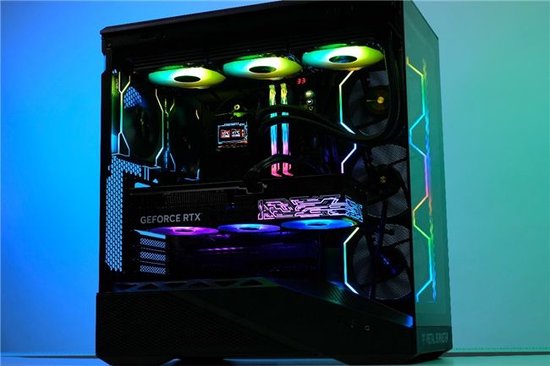 显卡的上机效果如下所示,可通过连接5V ARGB线与主板进行灯光同步。