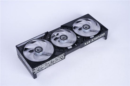 显卡的侧面镶嵌有炫彩RGB灯效,以流线型的电路图案为装饰(部分白色为非发光纹路),从侧面延伸到尾部,进一步突出赛博科技风格。