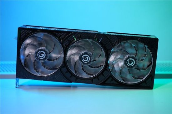 显卡正面外观如下,影驰GeForce RTX 5090 D大将采用了游星X散热器,为三风扇结构,由2*100mm+1*90mm三风扇组合,风扇支持ARGB灯效,整体以黑色为主色调,整体风格简约,细节上也有碳纤维纹理的设计,具有一定的科技感。