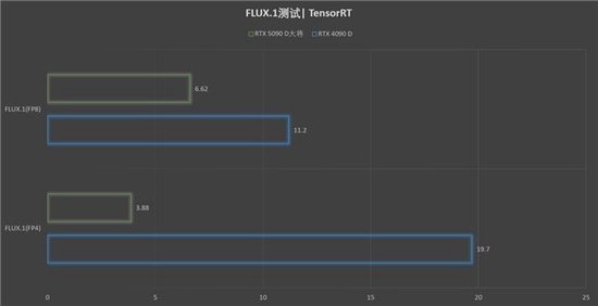 那么AI方面,使用AI开源生图模型FLUX.1进行测试,在FP8精度模型的运算下,5090D对比4090D的生图速度有着接近5秒的提升,而在使用FP4精度模型下,5090D明显要比FP8出图要出的快,而没有加速支持的4090D,则速度来到了19.7秒,明显要慢上不少。