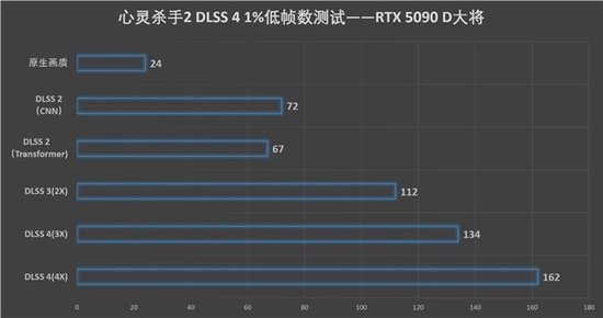 同样的,心灵杀手2作为首批支持DLSS 4的游戏,在开启DLSS 4后也迎来了帧数大幅度的增长,1%LOW帧在原生画质下只有24帧,而最高的DLSS 4开启后,能达到162帧,这个涨幅程度相当恐怖。