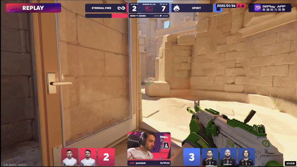 次回合Spirit强起失败。来到下半场第一个长枪局,donk先外场混烟拿到击杀,土匪随后上三楼配合正门夹A,放下雷包后二打二,sh1ro和zont1x双人配合拿下残局,比分来到11-5。第十八回合,暴露进攻意图的土匪只得进攻A区,zont1x回防打掉Wicadia,sh1ro也偷到jottAAA背身,只剩MAJ3R独木难支送出赛点。最终局,Eternal Fire进攻铁门被donk和magixx配合瓦解,chopper从三楼赶来也及时补防。Spirit以13-6比分拿下自己选图。