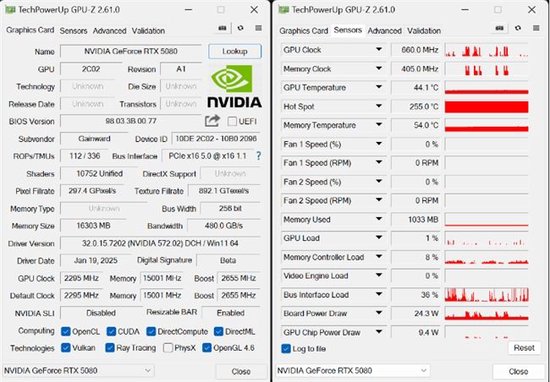 由检测软件GPU-Z可看到耕升 GeForce RTX 5080 炫光 OC更为具体的参数表现和实际规格。通过数据可以看到,在待机状态下,显卡温度为44.1℃,功耗为24.3W。