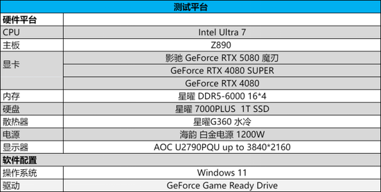 为了能让影驰 GeForce RTX 5080魔刃的性能在最大程度上发挥以及呈现,测试平台上采用了Intel Ultra 7,搭配Z890主板。内存上搭载4条星曜DDR5-6000Hz 16GB内存条,散热器方面则选择星曜 G360一体式水冷,配合海韵 1200W电源,让显卡性能能够稳定持续发挥。本次测试将为玩家提供影驰 GeForce RTX 5080魔刃的成绩,同时也将对比GeForce RTX 4080和GeForce RTX 4080 SUPER 两个型号的分数,让玩家能够直观地了解到影驰 GeForce RTX 5080魔刃的性能提升。