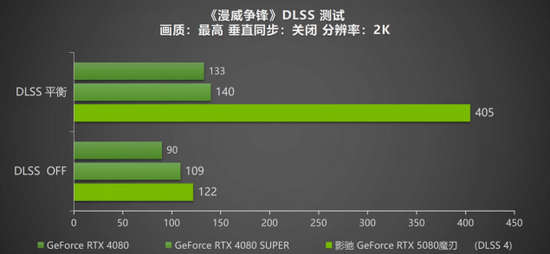 在2K分辨率下,影驰 GeForce RTX 5080魔刃的性能表现优异,尤其是在开启DLSS 4平衡模式后,帧率大幅提升达到405帧的惊人成绩,表现堪称出色。与关闭DLSS相比,开启DLSS为其带来了高达232.8%的显著提升,显示出其在性能上的巨大优势。