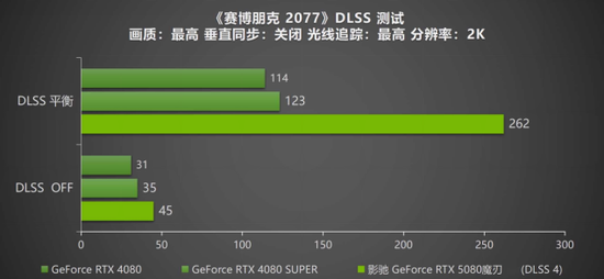 从测试结果来看,影驰 GeForce RTX 5080魔刃在DLSS 4技术的加持下,它的性能领先其他显卡,提供了显著的提升,帧数直接由45帧暴涨到262帧。虽然DLSS 3开启后,其余两张显卡的成绩也上涨的十分明显,但在DLSS 4面前显得略微逊色。