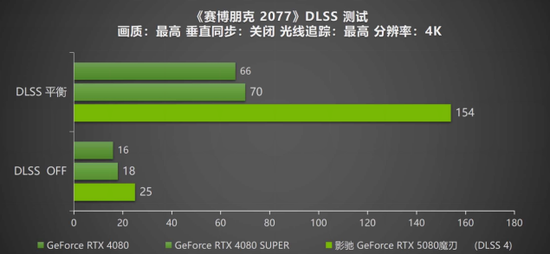 再看到4K分辨率下,在关闭DLSS模式时,影驰 GeForce RTX 5080魔刃的帧率为25 FPS,三张卡均未能实现流畅运行的标准。而在开启DLSS 技术后,影驰 GeForce RTX 5080魔刃在DLSS 4的加持下,提供了优异的帧率表现,帧数直接超越150帧。相较于GeForce RTX 4080和GeForce RTX 4080 SUPER,影驰 GeForce RTX 5080魔刃在游戏体验上的表现更为流畅和强劲,适合追求高性能游戏体验的玩家。