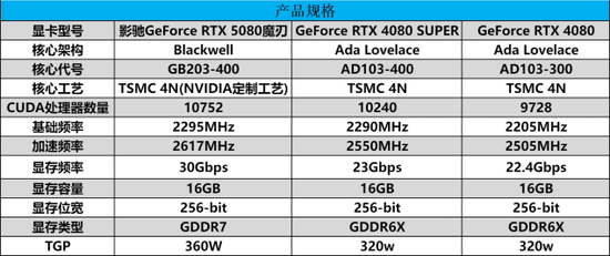 首先,我们可以直观的看到影驰 GeForce RTX 5080 魔刃与GeForce RTX 4080 SUPER和GeForce RTX 4080 的规格参数对比: