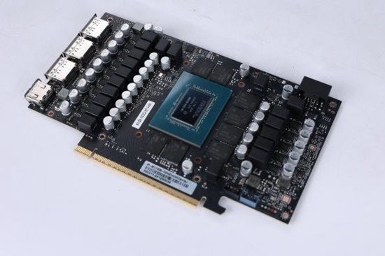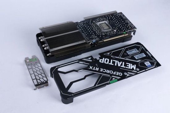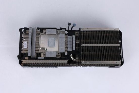 来到显卡尾端, 5根热管清晰可见,拆解以后观察散热器全貌,内部共有7根热管(规格为2*6mm 5*8mm);考虑到整卡功耗最高只有400W,这样的散热规格可以称得上是优秀了。