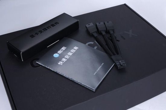 拆开包装,打开内盒,共有以下附带的配件,分别是16pin转3*8pin电源线、安装指南和显卡支撑杆。
