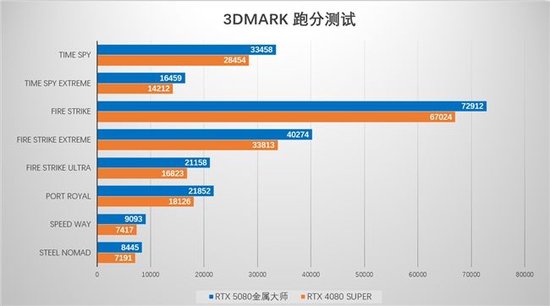 第一项我们的测试选择了3DMark(测试项目包括 Fire Strike、Fire Strike Extreme、Fire Strike Ultra、Time Spy、Time Spy Extreme、Port Royal、Speed Way、Steel Nomad共八个项目);考虑到GeForce RTX 5080这种级别的显卡主要是面向4K以及光线追踪游戏环境的解决方案,故而我们主要关注Fire Strike Ultra、Time Spy Extreme、Port Royal和Speed Way这4个项目的成绩;横向对比GeForce RTX 4080 SUPER显卡,上述4项的成绩分别有着25.7%、15.8%、20.5%、22.5%左右的性能提升。