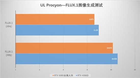 来了AI方面,在FLUX.1的图像生成测试中,无论是FP8还是FP4精度,影驰GeForce RTX 5080 金属大师OC 黑金版生成1张图的速度都明显优于GeForce RTX 4090D,在FP8精度下生成1张图,影驰GeForce RTX 5080 金属大师OC 黑金版甚至比GeForce RTX 4090D的时间还要快上2.5秒,速度提升巨大。