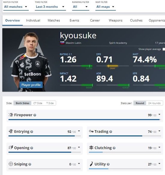 在过去的3个月中,kyousuke代表Spirit Academy出战平均获得1.26 rating。