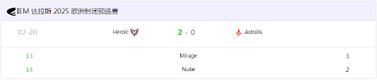 Heroic在欧洲封闭预选赛败者组决赛中以13-3、13-2横扫Astralis,成功跻身IEM 达拉斯站参赛队列。尽管Astralis因参加PGL 克卢日-纳波卡站消耗了备战时间,但芬兰教练sAw执教下的Heroic战队展现出的统治力仍远超预期。