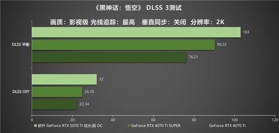 在2K分辨率下,耕升 GeForce RTX 5070 Ti 炫光·超 OC开启DLSS后可享受到103帧的平均帧数。与上一代GeForce RTX 4070 Ti SUPER和GeForce RTX 4070 Ti两款显卡进行对比,耕升 GeForce RTX 5070 Ti 炫光·超 OC有着大幅度的性能提升,轻松地拉开了性能差距。