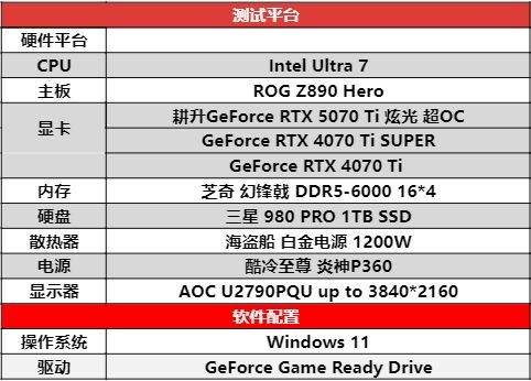 本次测试中,CPU选用了Intel Ultra 7,搭配ROG Z890 HERO主板,内存方面搭载了4条芝奇 幻锋戟 DDR5-6000Hz 16GB内存条,电源方面则采用了海盗船 白金1200W电源,散热部分则使用了酷冷至尊 炎神P360一体式水冷。这套经过精心设计的配置,不仅为GPU提供了高效的散热能力,还确保了稳定的电力供应,使得耕升 GeForce RTX 5070 Ti 炫光·超 OC在长时间的运行下能够稳定的发挥其卓越的性能。