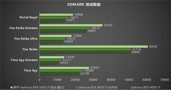 通过3D Mark软件的基准测试,可以得到耕升 GeForce RTX 5070 Ti 炫光·超 OC在各项指标上的分数,相较其余两者均有大幅度提升。在Fire Strike测试中,耕升 GeForce RTX 5070 Ti 炫光·超 OC的分数高达60547分,较RTX 4070 Ti实现了19%的增幅,彰显出其卓越的性能表现。