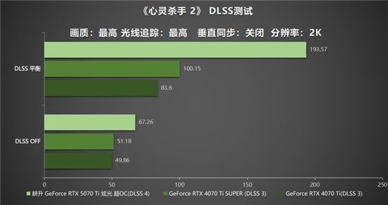 在2K最高画质下,GeForce RTX 4070 Ti SUPER和GeForce RTX 4070 Ti在DLSS 3性能模式中分别拥有100.15帧和83.6帧的表现,而耕升 GeForce RTX 5070 Ti 炫光·超 OC在DLSS 4平衡模式下,达到193.57帧的平均帧数,拥有近93%的性能提升。这也意味着在游戏过程中,几乎杜绝了任何卡顿与延迟等现象,使得玩家能够充分感受到光线追踪技术所带来的视觉体验,为玩家带来极致畅快的游戏体验。