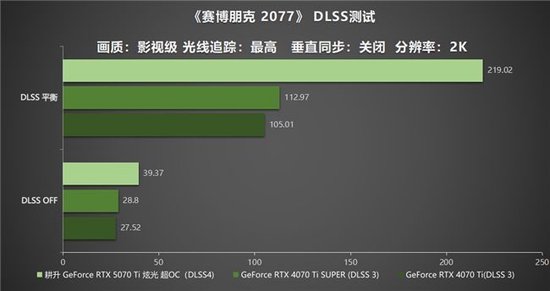 在2K的分辨率下,GeForce RTX 40系列显卡在开启DLSS 3技术时,平均帧数分别为112.97帧和105.01帧。而耕升 GeForce RTX 5070 Ti 炫光·超 OC在启用DLSS 4技术后,依旧能够跑到超过219.2帧的分数。