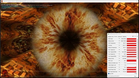 接下来使用负载软件FurMark来测试耕升 GeForce RTX 5070 Ti 炫光·超 OC的功耗控制能力。在开启负载软件压榨GPU后,待温度与功耗达到稳定,测试得出最终GPU功耗为300.4W,温度68℃,得益于耕升 GeForce RTX 5070 Ti 炫光·超 OC所搭载第三代「炫之黑曜石」散热器的散热能力,采用了穿透式散热系统设计。在保持性能提升的同时,还有效控制了功耗和散热成本,为玩家升级显卡提供全新的选择。