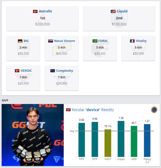 Astralis上一次晋级大型赛事总决赛还是在2021年1月份的BLAST Premier全球总决赛,在决赛中他们以0-2不敌Natus Vincere获得亚军。而他们上一次捧起大型赛事冠军还是在2020年12月份的IEM Global Challenge 2020(3-0战胜Liquid夺冠)。自那之后,Astralis在赛事中的成绩就再也没有超过3-4名。