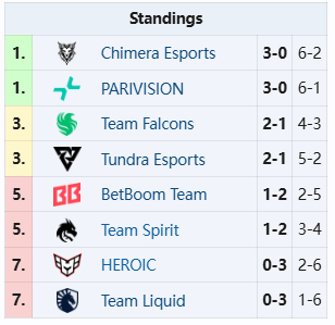 梦幻联赛S25第二阶段小组赛第三日结束,Liquid迟到判负于Falcons,Chimera 2-1逆转Spirit,Tundra 2-0战胜BB,PARI同样2-0击败Heroic。目前PARI和Chimera依然维持在榜首位置。