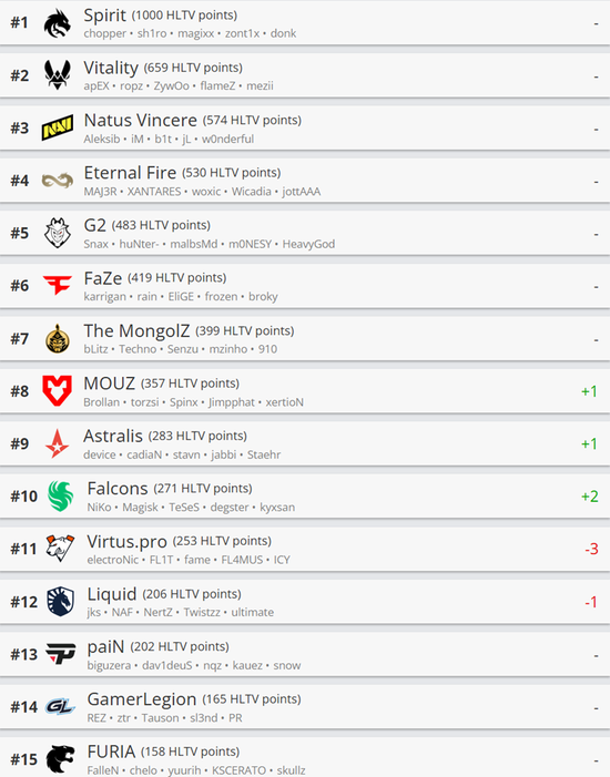 前十名当中Spirit战队依旧位列第一,1-7名没有任何变化。而MOUZ战队、Astralis战队和Falcons战队作为罗马尼亚的前三名队伍排名有所进步。Falcons上升2位进入Top10行列。