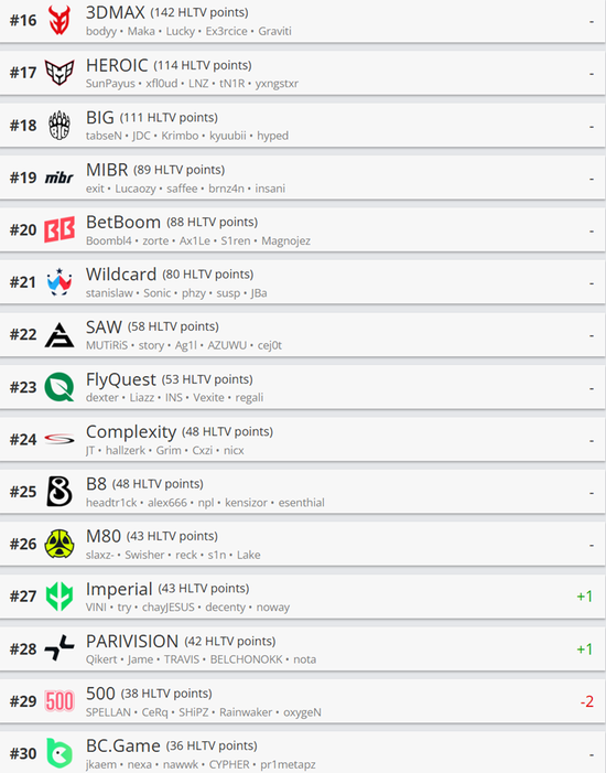 21-30名中Imperial和PARIVISION排名各上升一位。