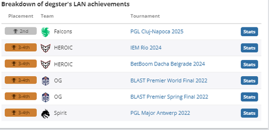 在刚刚结束的PGL 克卢日-纳波卡总决赛中,Falcons以1-3的比分不敌MOUZ无缘新阵容首冠。对于Falcons队内狙击手degster而言,这是他职业生涯第四次在线下赛总决赛折戟。这名俄罗斯选手分别在2024年Elisa 埃斯波大师赛、2024年TP 世界锦标赛和2019年俄罗斯电竞杯中获得亚军。除此之外,自2022年先后效力Spirit、OG和HEROIC战队以来,他还曾5次止步线下赛半决赛阶段。