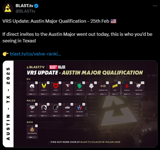 BLAST.tv 奥斯汀Major潜在直邀名单如下: