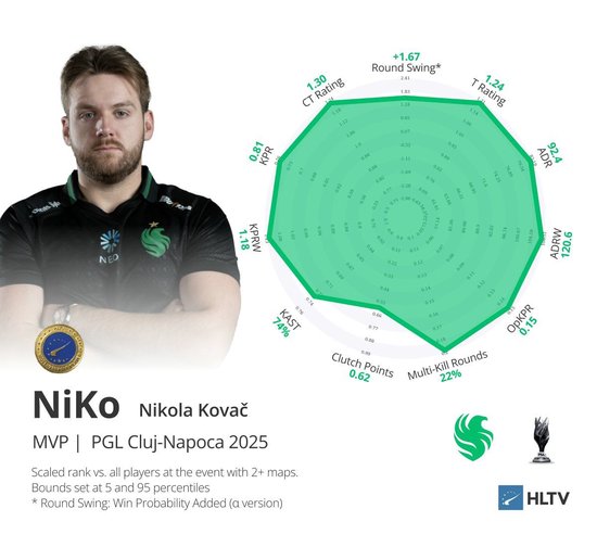 NiKo也竭尽全力,在决赛前Falcons的地图胜利中,他平均获得1.51的rating,带领新队伍击败了两大夺冠热门(FaZe和Eternal Fire)。