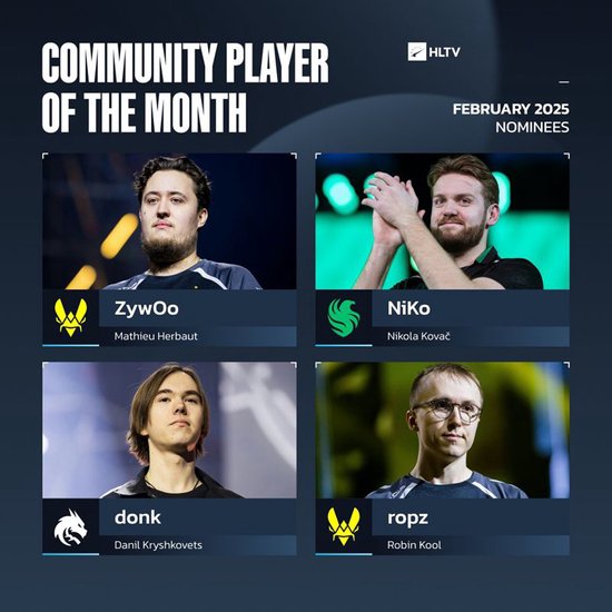 日前HLTV在社交平台上开启了2月代表选手的评选活动,本次的参选者数量和往常一样,都是四人。分别是ZywOo、NiKo、donk和ropz。