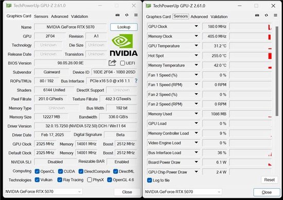由检测软件GPU-Z可看到耕升 GeForce RTX 5070 追风更为具体的参数表现和实际规格。通过数据可以看到,在待机状态下,显卡温度为31.2℃,功耗为6.1W。