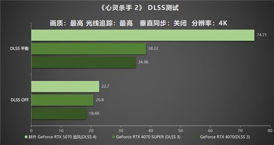 然而,随着画面精细度的提升,游戏对硬件配置的要求也显著增加。在测试中可以看到,在4K分辨率下,作为成绩最优异的耕升 GeForce RTX 5070 追风,在最高画质、光线追踪开启、DLSS关闭时,帧数也仅有22.7帧。而在开启DLSS 4技术后,性能有着卓越的提升,平均帧数达到了74.71帧,拥有近94%的性能提升。由此可见,在面对《心灵杀手2》这样对硬件配置要求极高的游戏时,耕升 GeForce RTX 5070 追风凭借DLSS 4技术的强大支持,也能让玩家感受到4K分辨率下流畅的游戏体验。